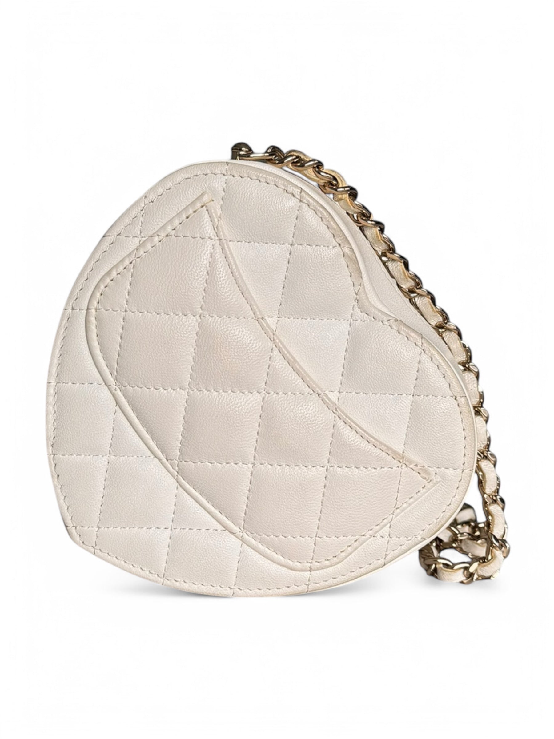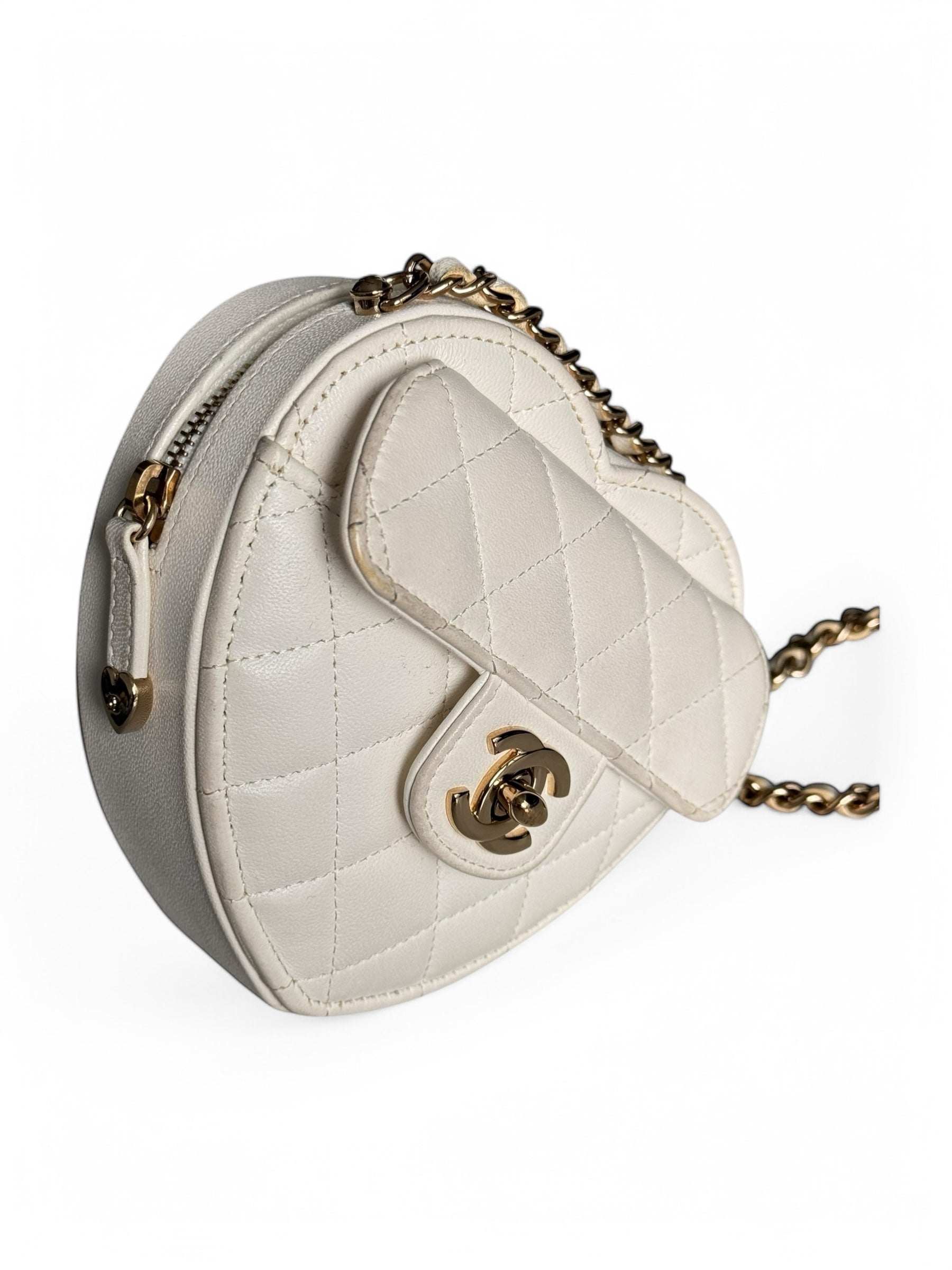 A rare and iconic Chanel Heart Mini Bag, crafted from luxurious white leather. This highly coveted piece is perfect for collectors and fashion enthusiasts alike, adding a touch of elegance and charm to any outfit.