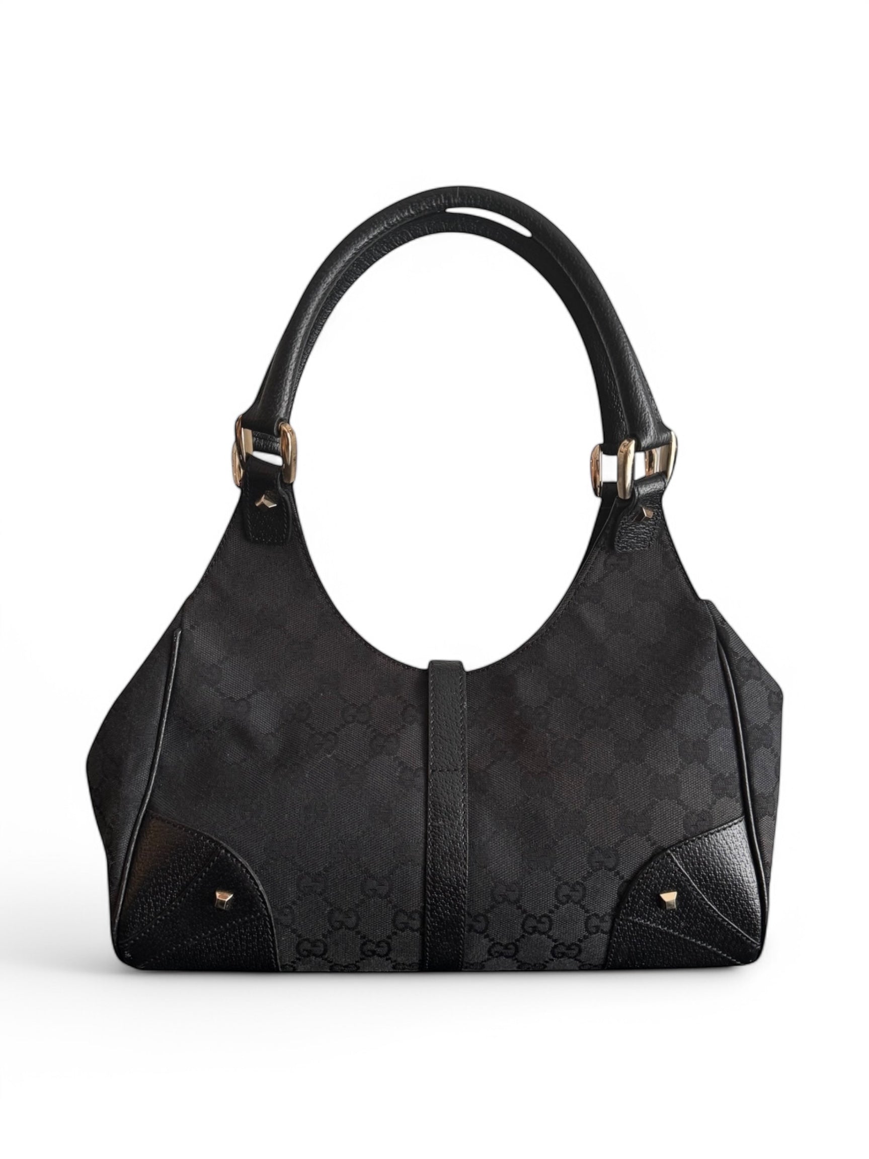 A true classic, the Gucci Jackie bag features the signature piston clasp closure and is crafted from leather and canvas in an elegant black finish. This timeless piece is perfect for adding a touch of sophistication to any outfit.