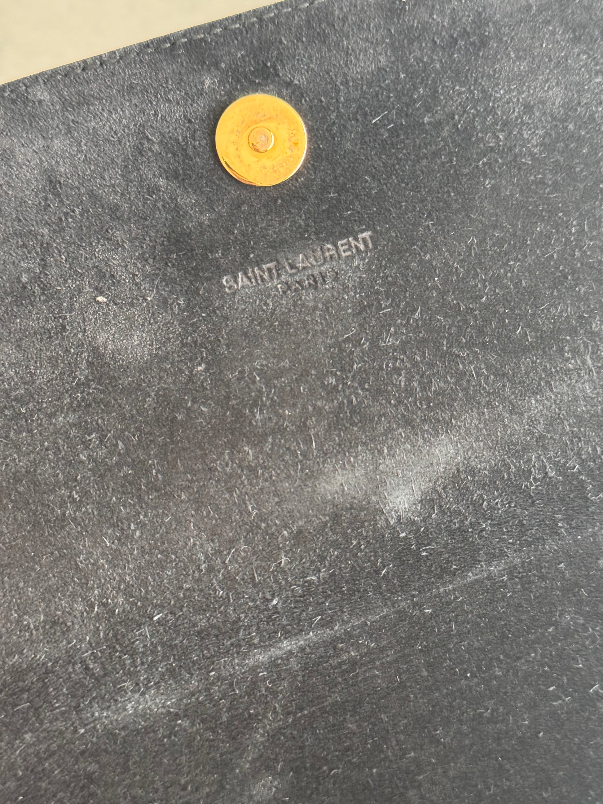 An iconic YSL Kate clutch, crafted from sleek black patent leather, perfect for elevating any evening ensemble. This timeless piece features the brand’s signature elegance with a refined silhouette.